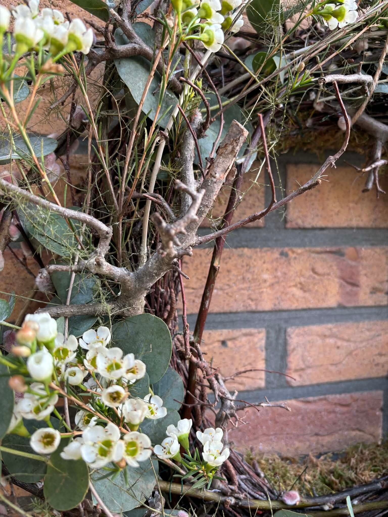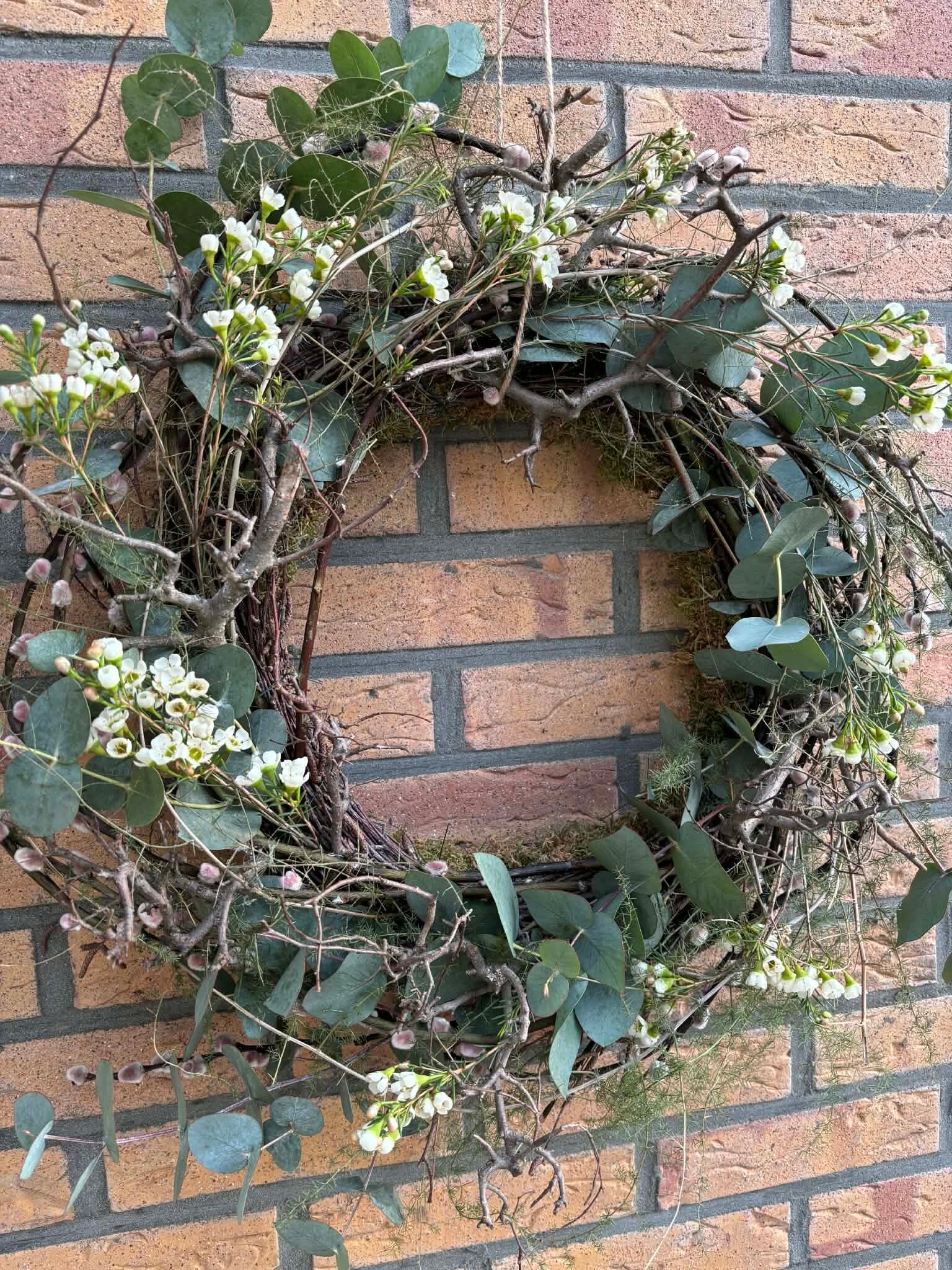 Diameter van 50 cm met materialen zoals. Salix katje, Eucalyptus, Bonsaitakjes, Wilde asperagus.